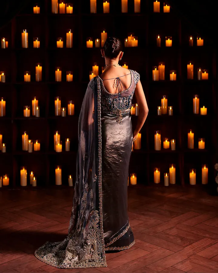 Embodying timeless sophistication, Lenita captivates with its statuesque silhouette. Crafted on a steel blue hue, the velvet blouse and tissue saree come heavily adorned with artisanal design elements of tilla, dabka and cutdana making it the ultimate festive ensemble that you will cherish for years.