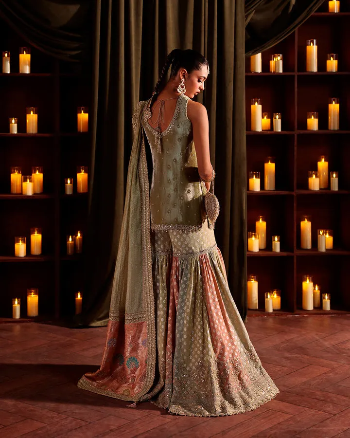 Showcasing a classic silhouette, Zerra mesmerizes with its eye-catching aesthetics. Crafted on a muted olive green, the velvet shirt features delicate patterns of dabka, sequins and cutdana. Paired with a voluminous, embroidered karandi gharara, embroidered zari net dupatta and an embroidered chiffon dupatta, this set is truly one-of-a-kind that will ensure you shine at all your festive events.