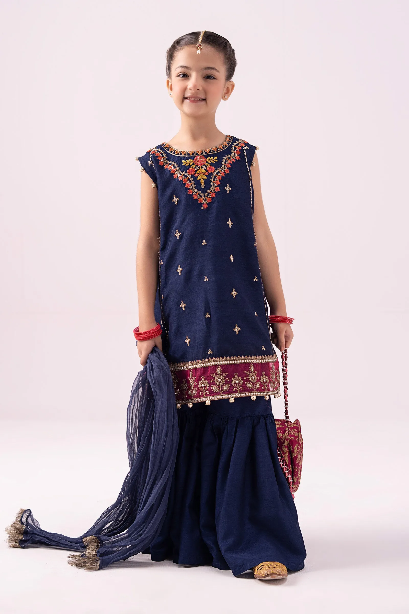 Adding a sense of sophistication to your little one’s festivities with our 3 piece embroidered raw silk suit; featuring a sleeveless A-line shirt adorned with organza embroidered border and tilla balls embellishment and paired with dyed gharara and kiran-laced crushed dupatta that gracefully styles all your occasions.