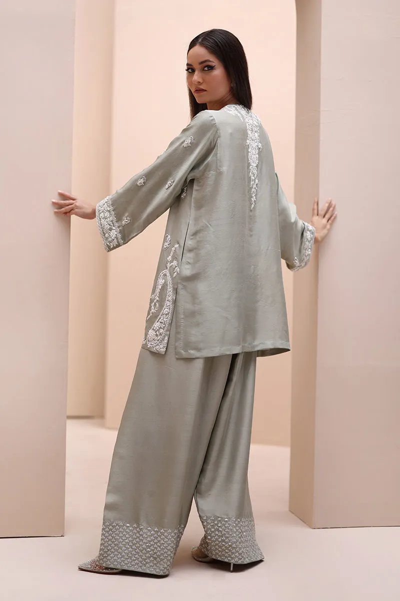 Timeless Elegance in Desert Sage – This luxurious ensemble is crafted from Pure Raw Silk for the Shirt and Shalwar, complemented by a delicate Pure Organza Dupatta. Adorned with intricate all-over Ivory Resham and Lorix embroidery, it features exquisite handwork detailing with Moti, Crystals, Tikki Stones, Sequins, Cutdana, and Pearls. The ensemble is further enhanced with a sequins handwork border, while the dupatta showcases all-over sequins chan with crystal hangings on the pallu, exuding sophistication and charm.