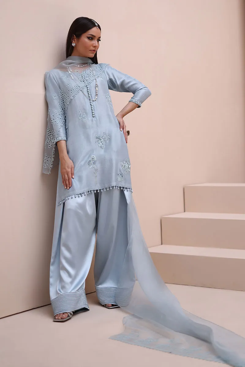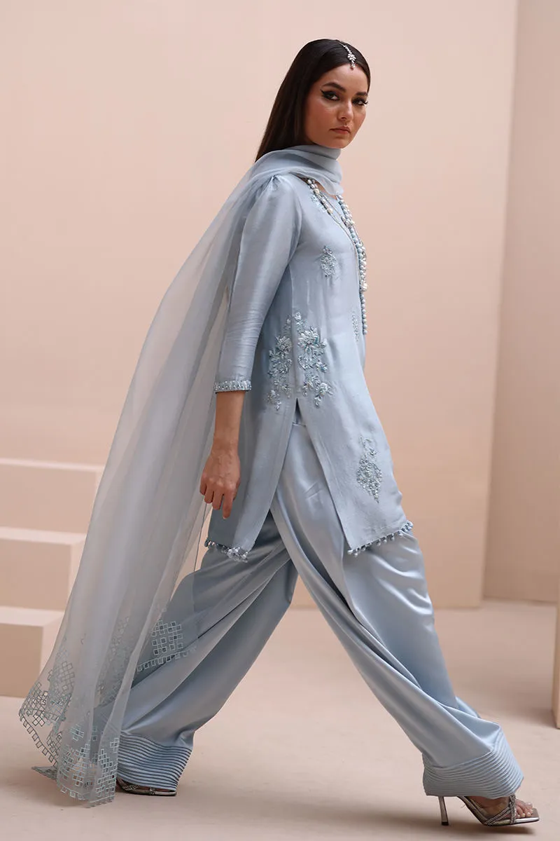 Ethereal Beauty in Cloud Blue – This stunning ensemble is crafted with a Pure Raw Silk Shirt, Crepe Silk Shalwar, and a delicate Pure Organza Dupatta. Featuring all-over self-Resham embroidery, it is intricately adorned with handwork using Moti, Tikki Stones, Sequins, Cutdana, and handmade hangings on the daman. The shalwar boasts elegant Pintex detailing on the bottom, while the dupatta is beautifully finished with Resham embroidery and delicate cutwork on the pallu, making it a timeless statement of grace and refinement.