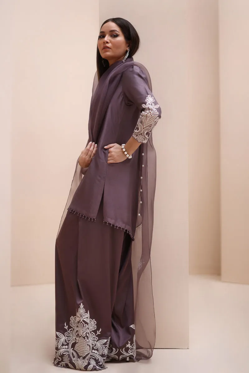 Refined Sophistication in Sparrow – This elegant ensemble features a Pure Raw Silk Shirt, Shine Silk Shalwar, and a delicate Pure Organza Dupatta. The shirt is adorned with exquisite Ivory Resham Tarkashi embroidery on the sleeves, complemented by handcrafted bunches on the neckline and handmade hangings on the daman. The shalwar showcases intricate Ivory Resham Tarkashi embroidery on the bottom, while the dupatta is gracefully finished with handcrafted tassels on the pallu, adding a touch of timeless artistry and sophistication.