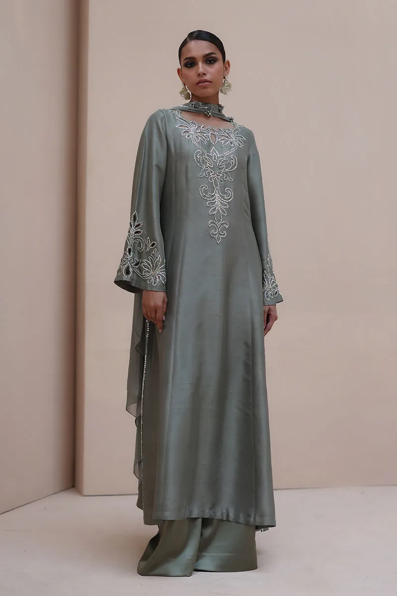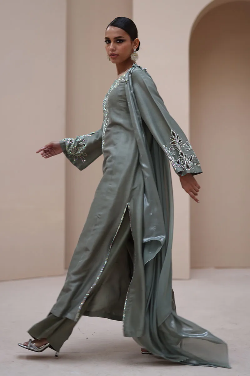 Serene Elegance in Iceberg Green – This exquisite ensemble features a Pure Raw Silk Shirt, Shine Crepe Silk Culottes, and a delicate Lame Chiffon Dupatta. Adorned with intricate hand-stitched stonework on the neckline, sleeves, and side slits, it exudes a refined and graceful charm. The ensemble is further enhanced with delicate handwork boti and chan embellishments, adding a subtle shimmer for an effortlessly sophisticated look.