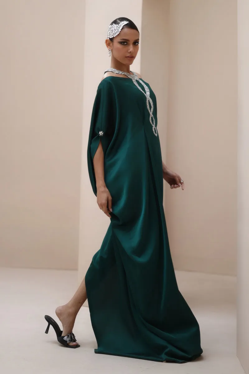 Elegant Charm in Alpine Green – This exquisite kaftan, crafted from luxurious Textured Silk, is adorned with intricate hand-stitched stonework on the neckline and delicate boti embellishments on the sleeves. A timeless statement of sophistication and grace.