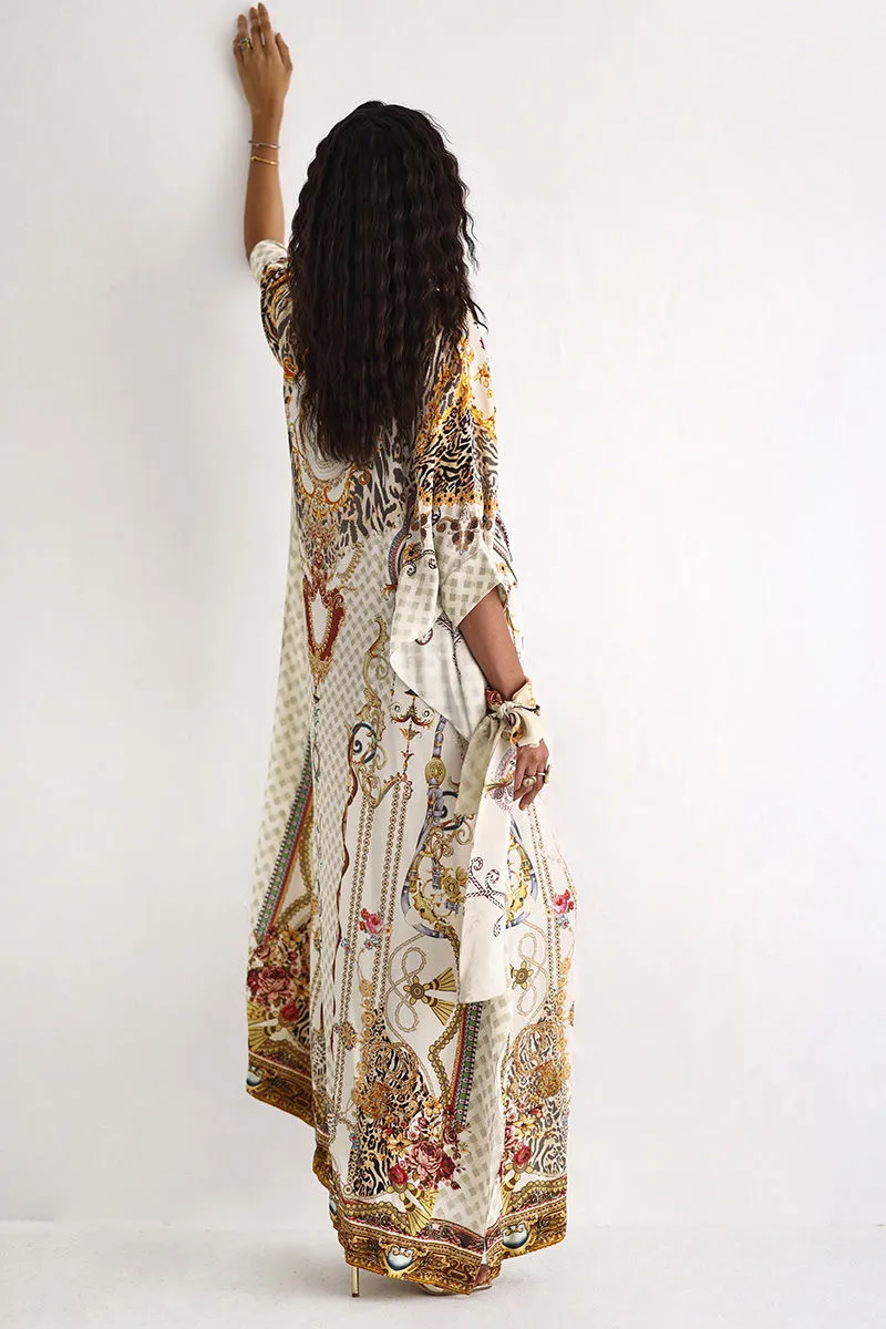 A statement silhouette brought to life with digital print and embellishment of imported colored stones, textured stones, cutdana, metals, crystals, sequins, and 3D flowers. Each element is thoughtfully placed to create depth, dimension, and a refined festive finish.