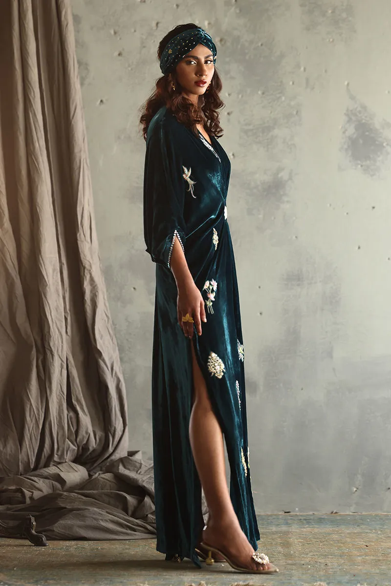 Elevate your style with our exquisite Pleated Kaftan in Peacock Teal, crafted from luxurious pure velvet. With a length of 58 inches, this stunning kaftan features intricate front and back embroidery in vibrant coloured resham, accented with silver, gold zari, and lorex zari. The handwork on the front and back is beautifully detailed with stones, sequins, and cutdana, adding layers of elegance.