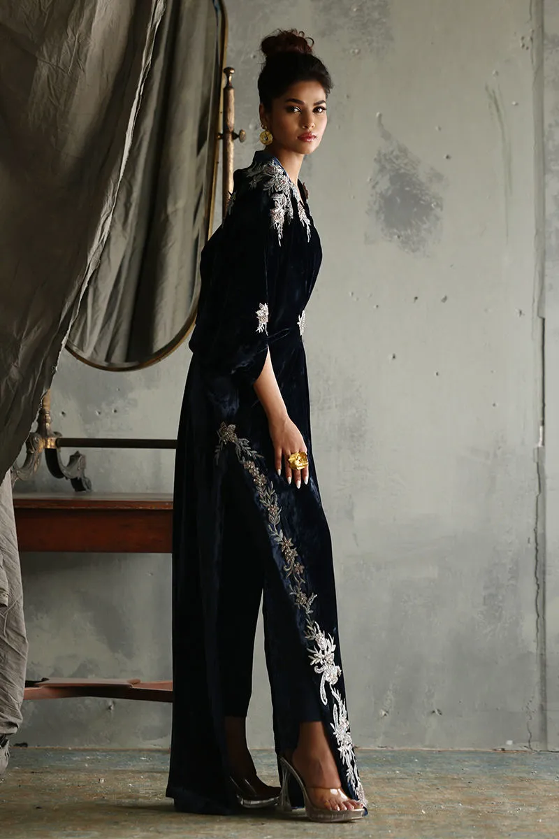 Discover the elegance of our Midnight Blue Pleated Kaftan, crafted from luxurious pure velvet for a rich and sophisticated feel. This stunning kaftan features a length of 58 inches, designed to create a graceful silhouette. The exquisite embellishments on the side slits, neckline, shoulders, and sleeves are intricately detailed with resham, zari, sequins, moti, cutdana, tikki stones, and pearls, adding a touch of opulence to the design. Perfect for special occasions or evening events, this pleated kaftan is a versatile and stylish addition to your wardrobe. Embrace the allure of timeless beauty with this captivating piece!
