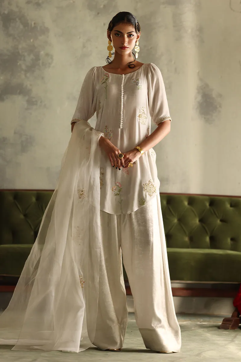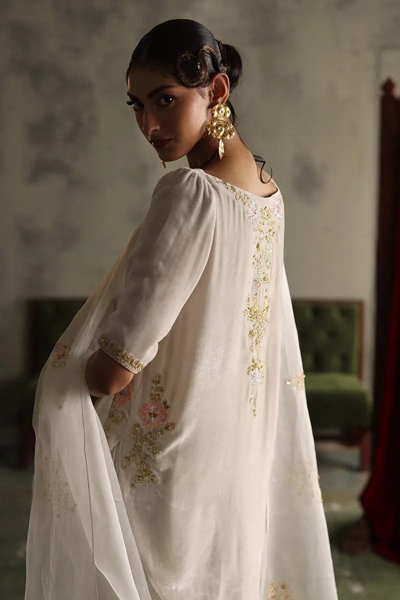 This stunning winter white ensemble radiates elegance and sophistication. The short shirt, is crafted from pure velvet with a 33-inch length, featuring intricate zari bunches accented with colored Resham, zardozi, sequins, cutdana, tikki stones, and naqshi for a luxurious textured finish. Paired with a 42-inch shimmer crepe shalwar, the outfit combines traditional charm with a hint of modernity. A pure organza dupatta, embellished with delicate handwork, completes the look, adding a soft, graceful layer to this timeless winter white set.