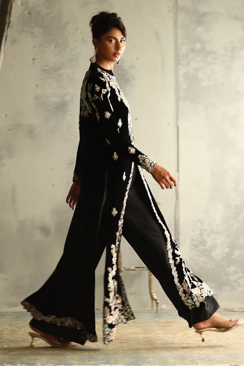 This luxurious straight long jacket and inner set in black offers a refined and opulent look. The jacket, is crafted from pure velvet with a 54-inch length, featuring intricate handwork on the front, back, and sleeves. The embroidery includes Resham, crystals, moti, kora, dabka, naqshi, pearls, sequins, tikki stones, cutdana, and sequence flowers, creating a stunning, textured design. The inner, made from pure raw silk with a 30-inch length, complements the jacket beautifully. Paired with 42-inch culottes in pure raw silk, this ensemble combines elegance and sophistication, making it a perfect statement piece.