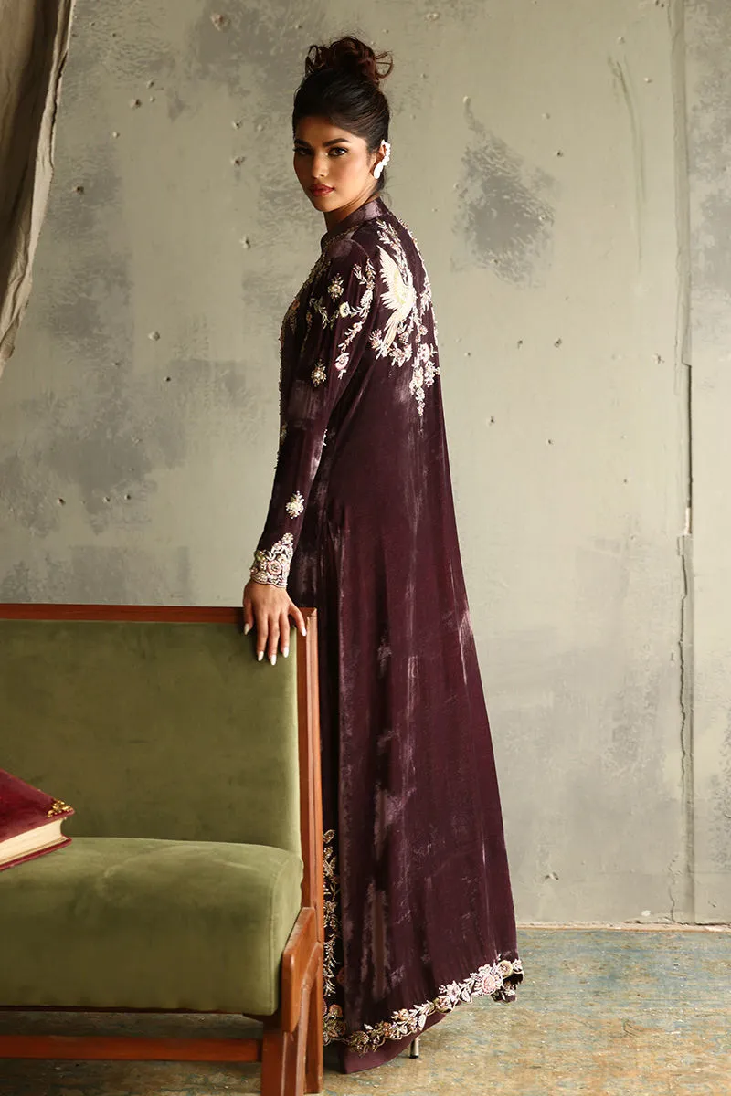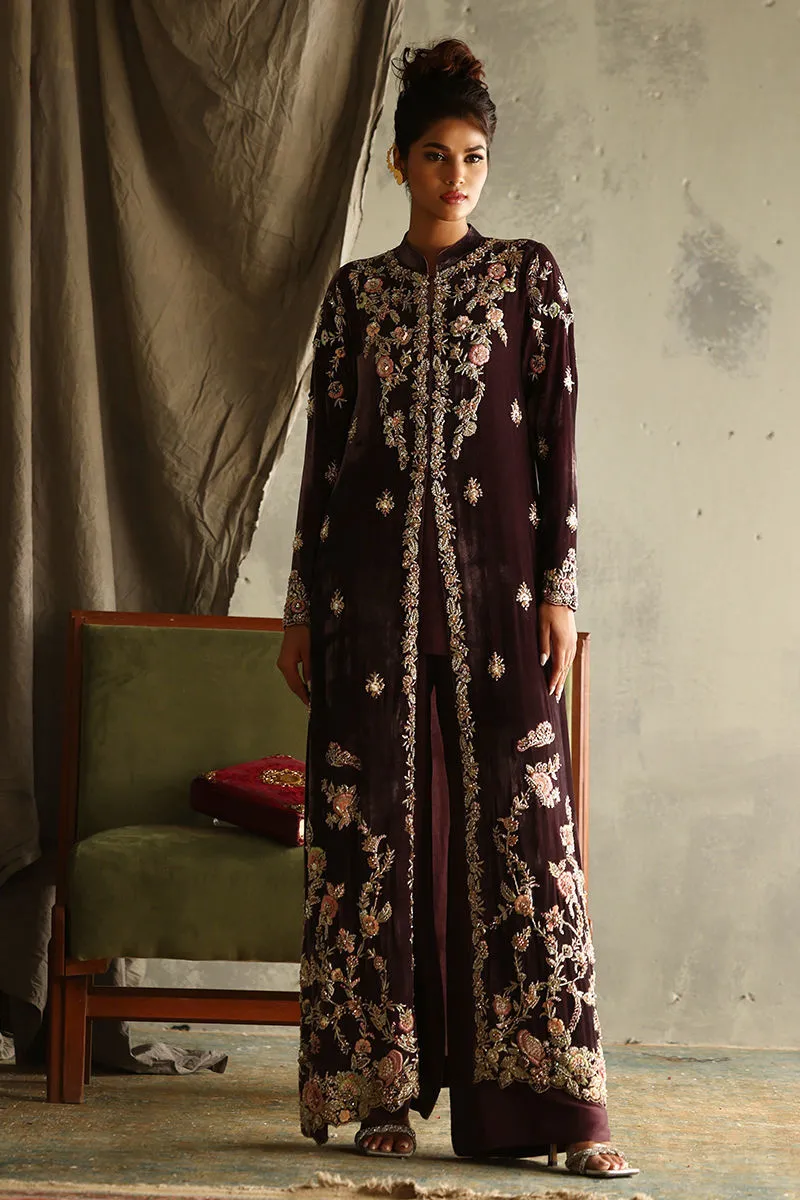 This elegant dark taupe straight long jacket and inner set is the epitome of luxury and craftsmanship, the jacket is made from pure velvet with a 54-inch length, featuring exquisite handwork on the front, back, and sleeves. The intricate embroidery includes Resham, crystals, moti, kora, dabka, naqshi, pearls, sequins, tikki stones, cutdana, and sequence flowers, creating a rich, textured design. The inner, crafted from pure raw silk with a 30-inch length, enhances the overall elegance. Paired with 42-inch pure raw silk culottes, this ensemble radiates sophistication and opulence, making it a perfect statement piece.