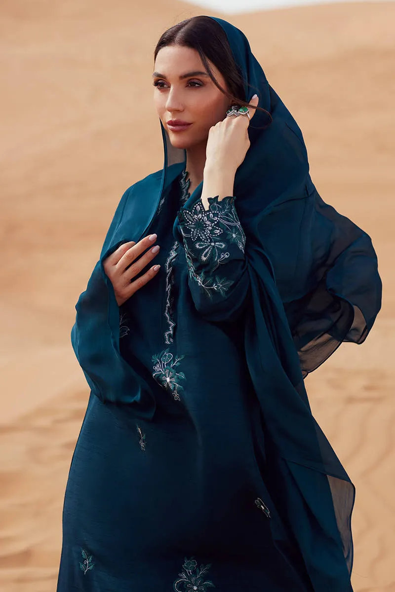 A longline shirt crafted in Korean silk, elevated with refined embroidery and a fluid structure. Paired with a tailored cigarette pant in matching Korean silk for a sharp, contemporary silhouette. Finished with a lightweight KP silk dupatta, adding subtle movement and modern polish.