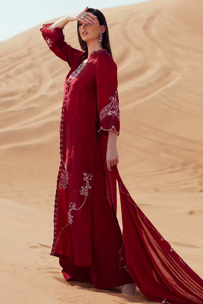 A self-tissue paneled, front-open shirt layered over a structured bustier, designed with intricate paisley motif embroideries and delicate hand-worked embellishments along the neckline. The sleeves are finished with paisley scalloped patch detailing for added dimension. Paired with clean-cut Korean silk straight pants and completed with a KP silk dupatta, featuring refined scalloped embroidery for a polished, contemporary finish.