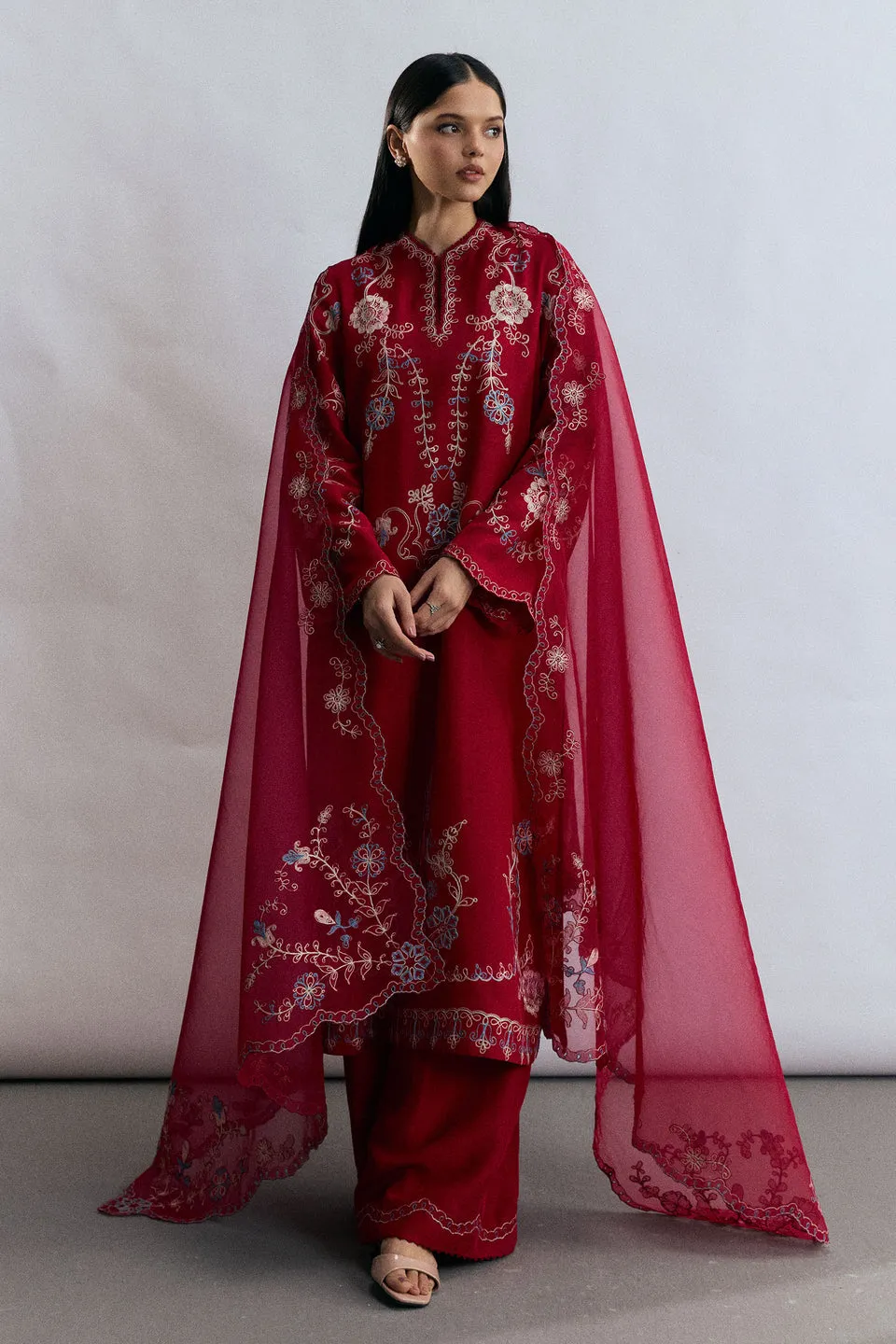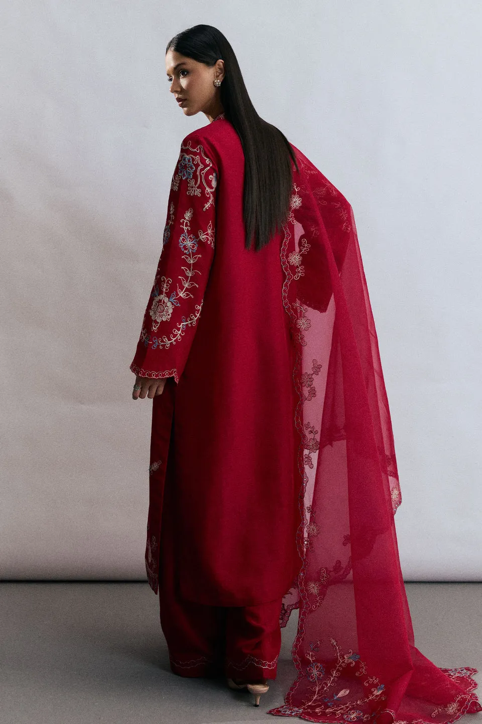 A crimson red raw silk ensemble that exudes timeless festive elegance. The shirt is adorned with ivory and blue resham aari embroidery, finished with delicate lace detailing on the neckline. Paired with a sleek, embroidered bottom, the look is completed with a stunning embroidered organza dupatta, creating a refined silhouette perfect for celebratory occasions.