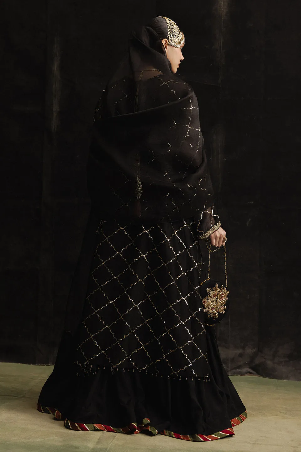 Kubra is an ensemble that commands attention the moment you enter the room. Crafted in a striking black palette, the five-panel pure organza kurta is elevated with a korean raw silk bustier, intricately adorned with a sequin jaal and a delicately embellished neckline. Embroidery, further enriched with traditional adda work, creates a refined interplay of texture and shimmer.